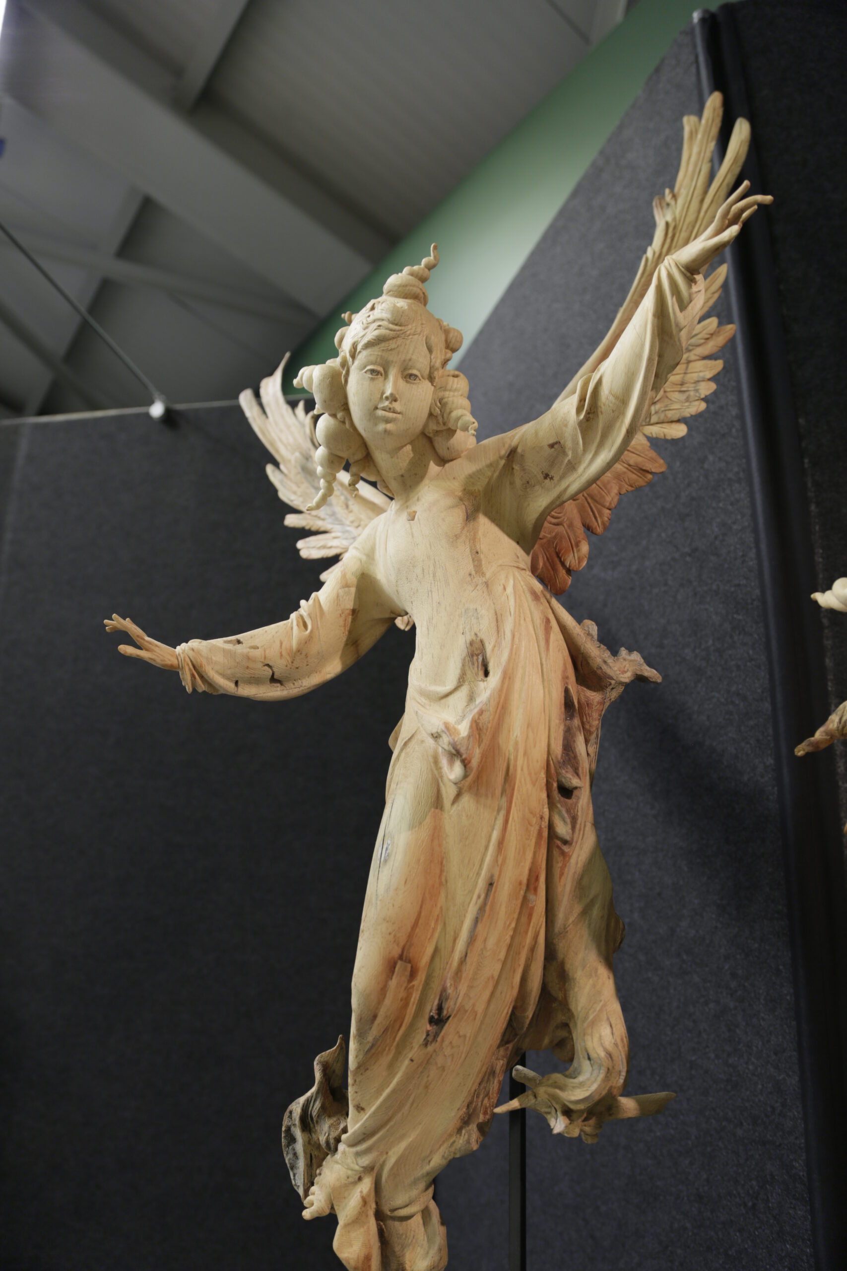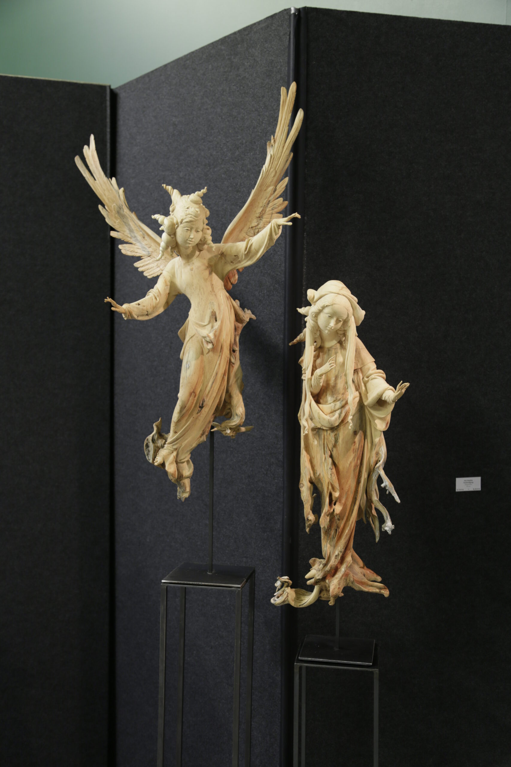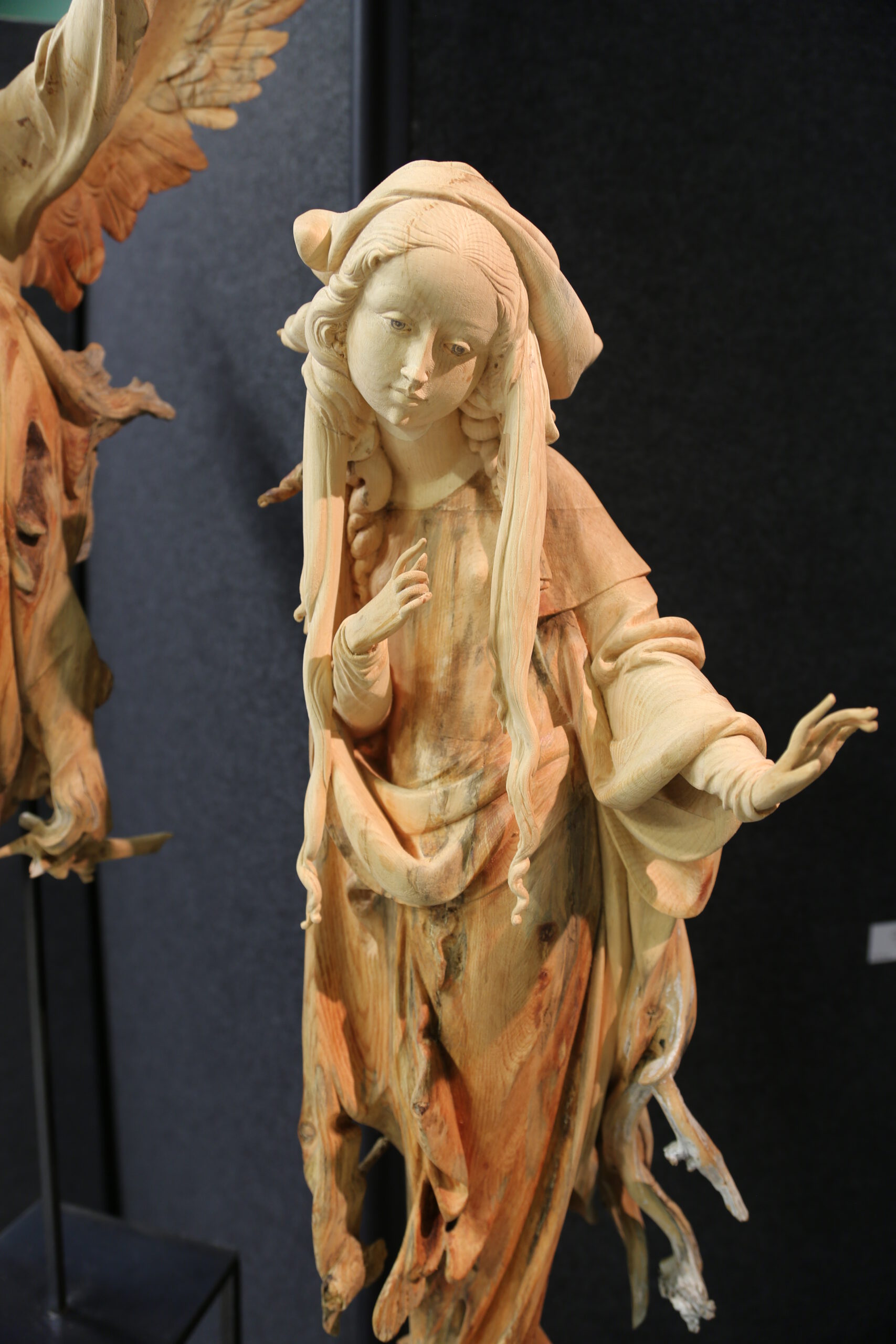 Ein zarter Engel in schwebender Bewegung begegnet der demütigen Maria – eine Holzskulptur voller spiritueller Kraft und poetischer Leichtigkeit.