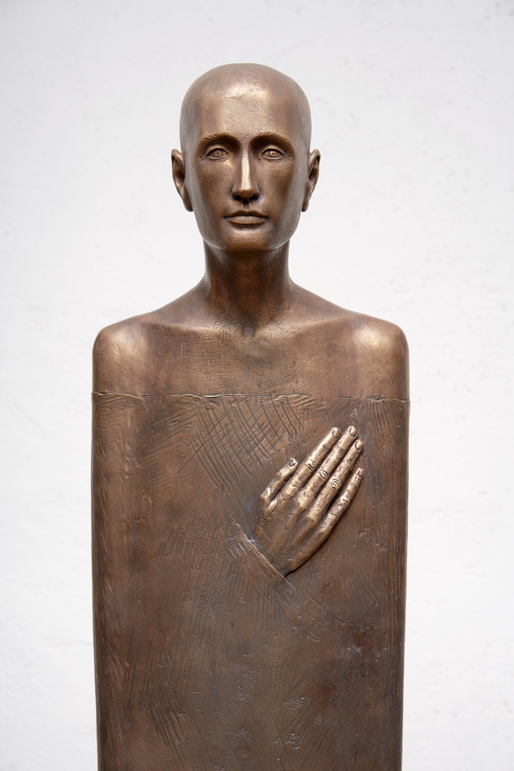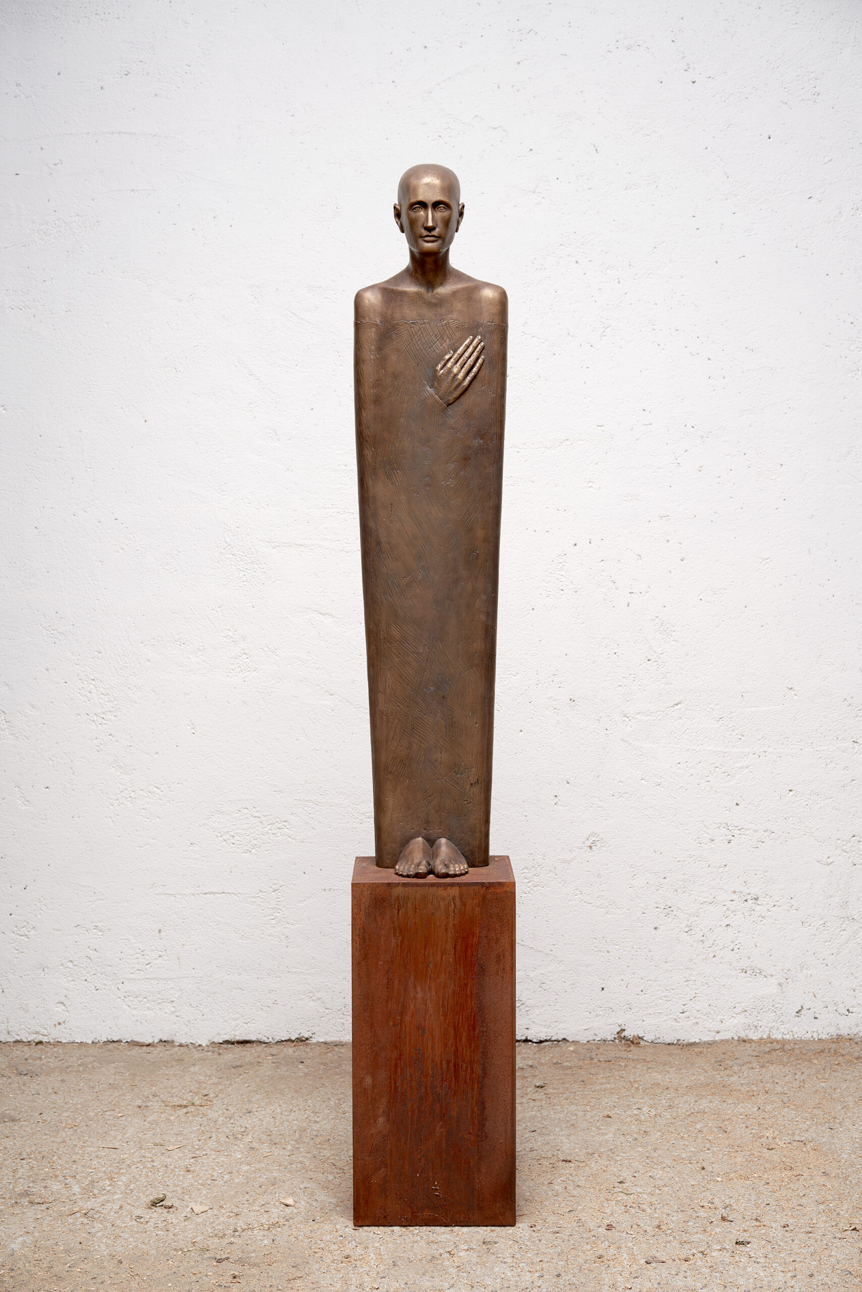 Die Figur „Gefühle entdecken“ wirkt wie ein stiller Zeuge innerer Prozesse. In der Bronze verschmelzen Haltung, Blick und Geste zu einer kontemplativen Präsenz. Die flache Form, die ruhige Ausstrahlung und die reduzierte Körperlichkeit lassen die Skulptur fast schwerelos erscheinen – eine Einladung zur Selbstbegegnung. Die aufliegende Hand über dem Herzen spricht von Achtsamkeit und Wahrnehmung, von einem Moment der Einkehr.