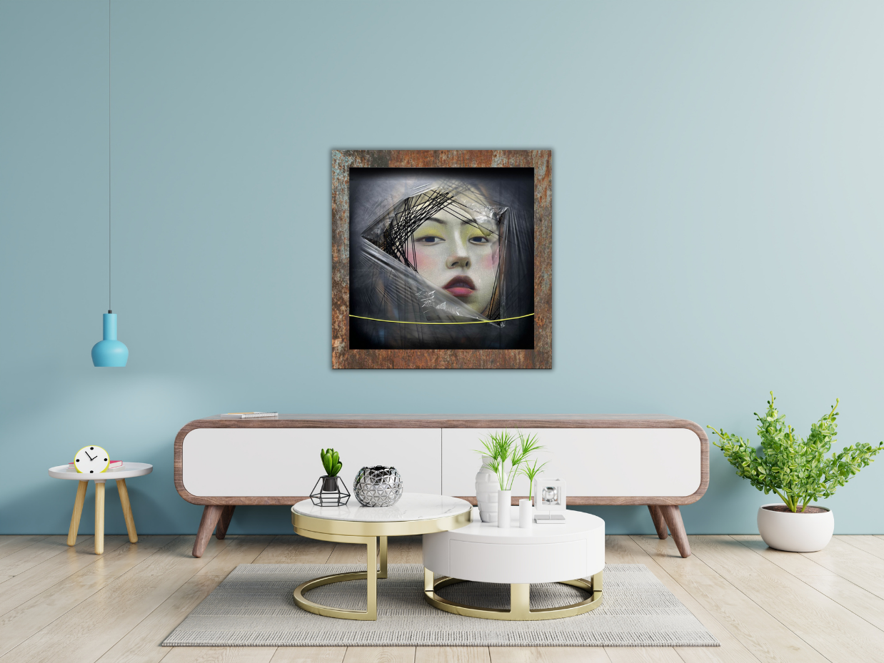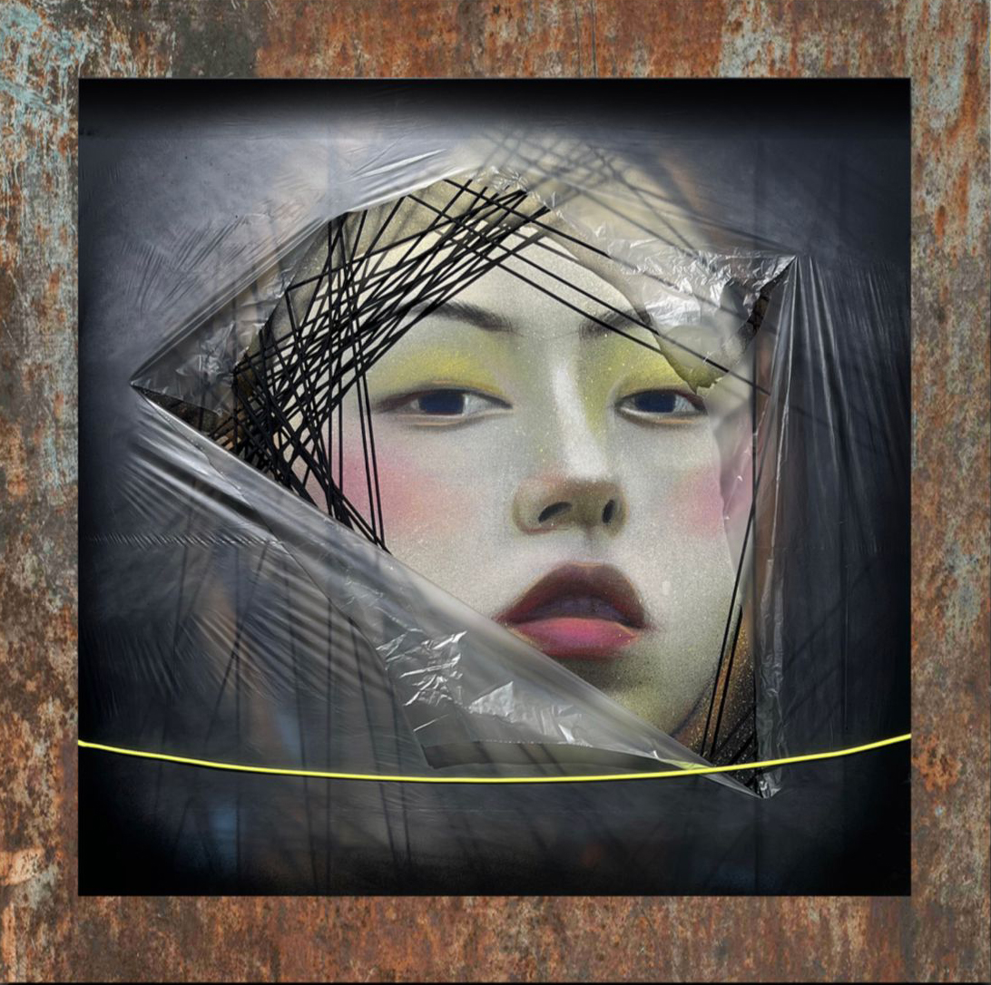 Das Werk Himitsu entfaltet sich wie ein verborgenes Flüstern – ein visuelles Rätsel, bei dem sich das Sichtbare dem Zugriff entzieht. In der Mitte ruht ein scheinbar klassisches Porträt, ruhig und ausdrucksstark, doch eingefasst von realen Materialien: transparente Nylonfolie, gespannte schwarze Seile und ein rostiger Metallrahmen. Das Besondere daran: Das Nylon ist nicht gemalt, sondern physisch im Werk integriert – es bewegt sich bei Luftzug, verändert mit Licht und Bewegung seine Wirkung, macht die Grenze zwischen Bild und Raum durchlässig.