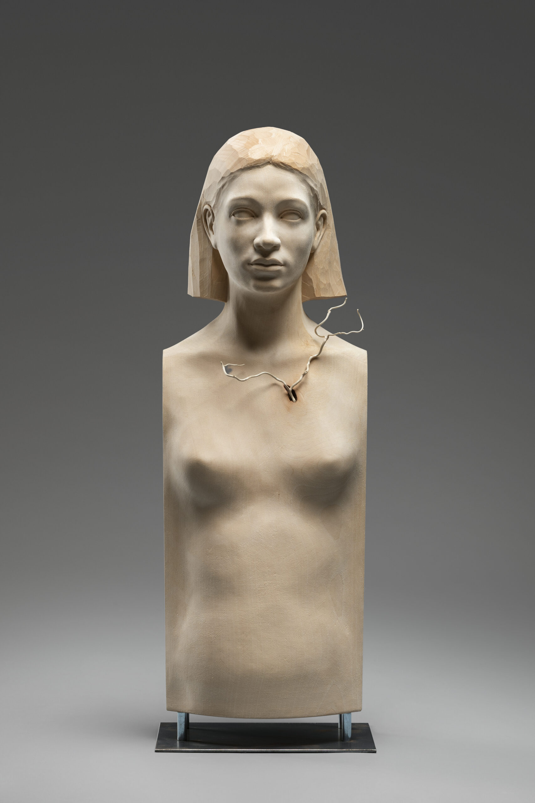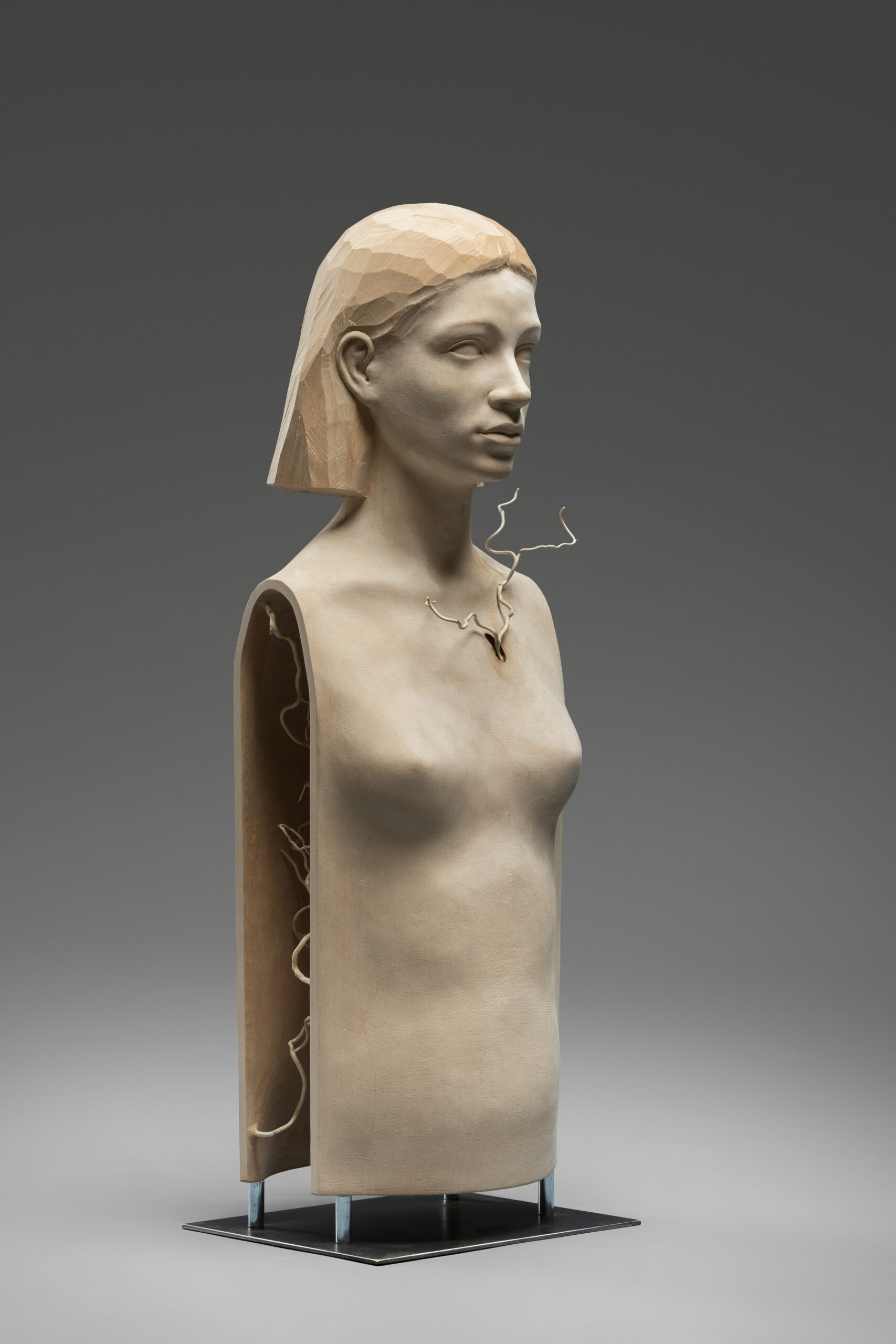 In Inside Life gestaltet Thomas Delazer das Porträt einer jungen Frau, das sich zwischen äußerer Klarheit und innerer Bewegung entfaltet. Der ruhig modellierte Oberkörper ruht in sich, während aus der Brustpartie feine, wurzelartige Linien hervortreten und sich ins Innere fortsetzen. Das Lindenholz, teilweise roh belassen und in seiner Maserung sichtbar, verstärkt die Spannung zwischen glatter Oberfläche und dem organischen Geflecht im Inneren. So öffnet sich die Figur gleichsam nach außen wie nach innen: ein Sinnbild für das Verborgene, das unser Leben durchzieht und unsichtbar trägt.