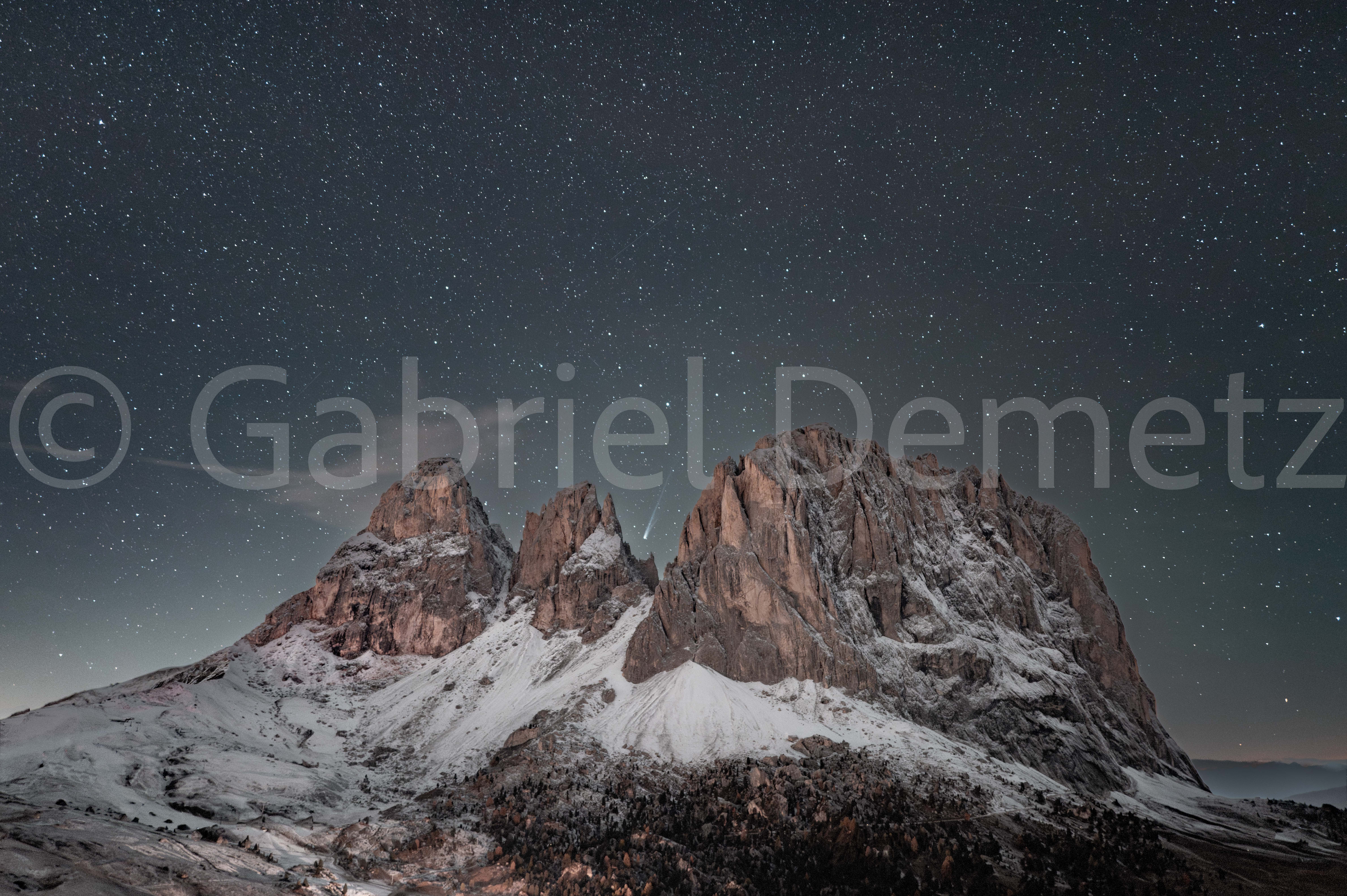 In dieser Fotografie von Gabriel Demetz leuchtet der Komet C/2025 A6 (Lemmon) über der Langkofelscharte in den Dolomiten. Das warme Restlicht des Abends trifft auf das kalte Glitzern des Schnees, darüber spannt sich der klare Nachthimmel mit der feinen Spur des Kometen – ein Moment, der nur mit viel Planung und Geduld eingefangen werden konnte.