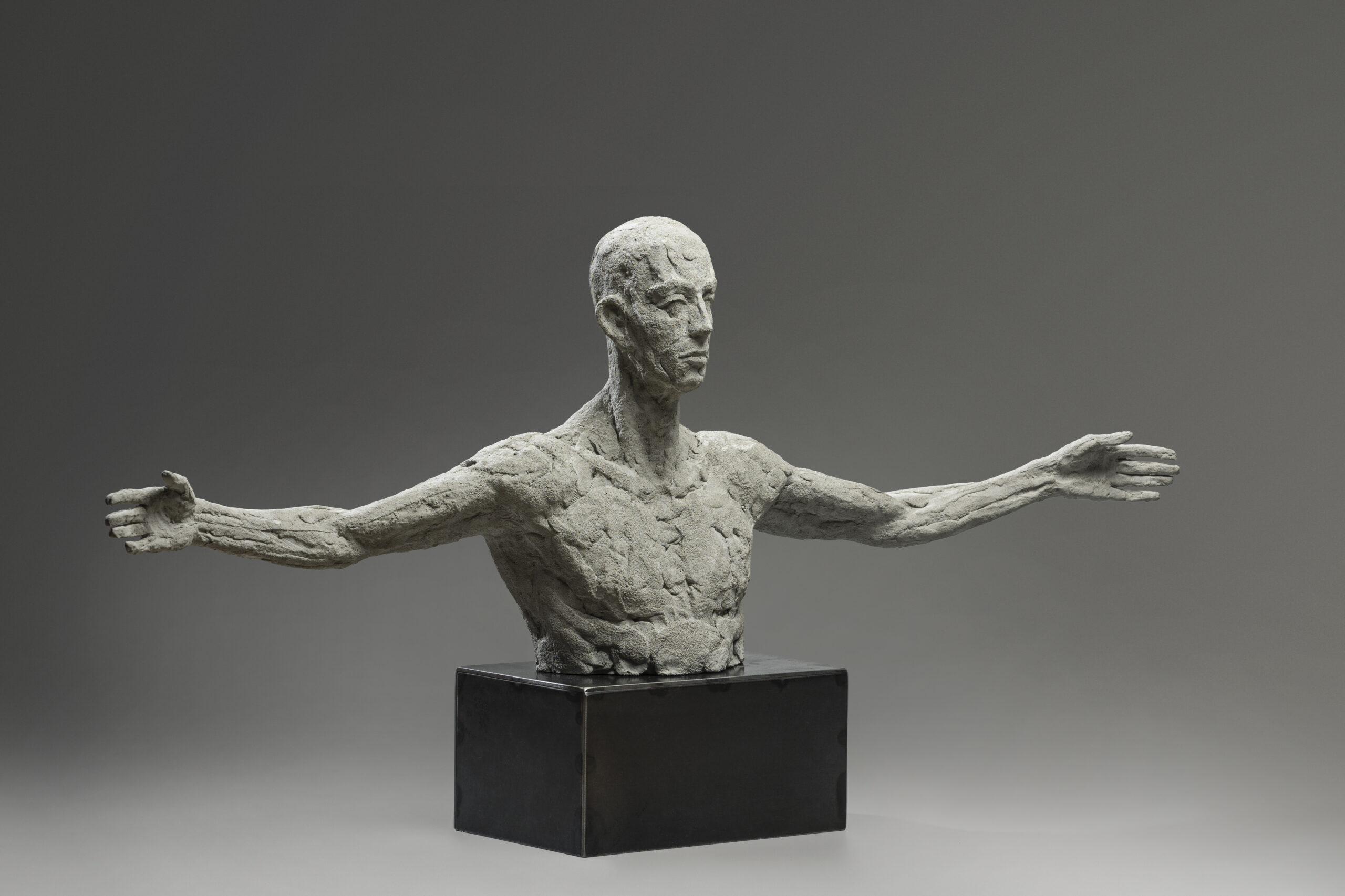 Mit open arms, open mind schafft Thomas Delazer eine Figur, die zugleich kraftvoll und verletzlich wirkt. Der Torso mit ausgebreiteten Armen erhebt sich auf einem dunklen Eisensockel und öffnet sich dem Raum. Die grobe Oberfläche des Betons betont Spuren, Brüche und Unregelmäßigkeiten – als Spiegelbild menschlicher Erfahrung. In der Weite der Geste wird der Körper zu einem Sinnbild von Vertrauen und Hingabe, ein Aufruf zu Offenheit im Denken wie im Fühlen. Die rohe Materialität verleiht der Skulptur eine archaische Präsenz, die über den Moment hinausweist.