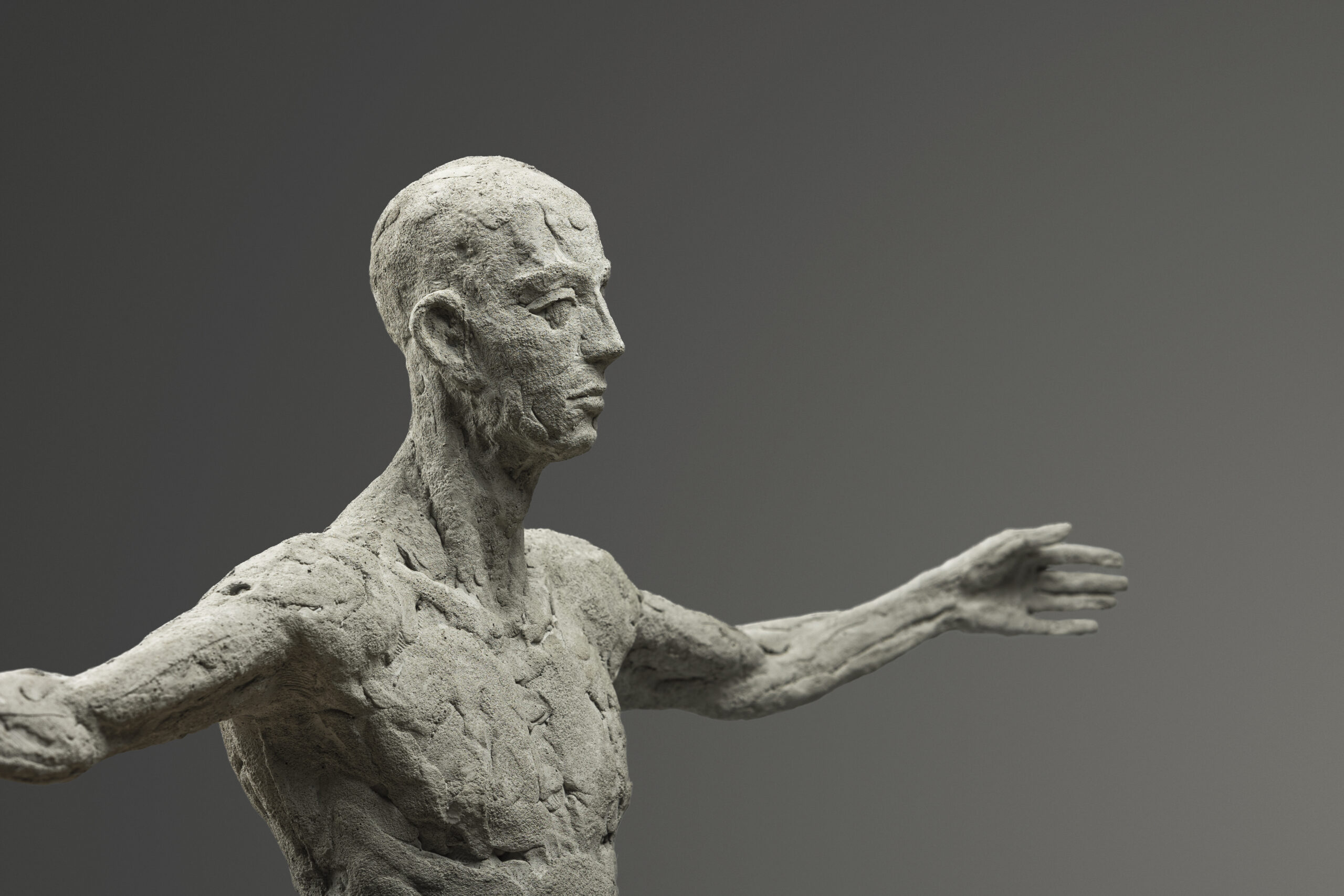 Ein Körper aus rauem Beton, weit ausgebreitet in Geste und Geist – Symbol von Offenheit und Begegnung.