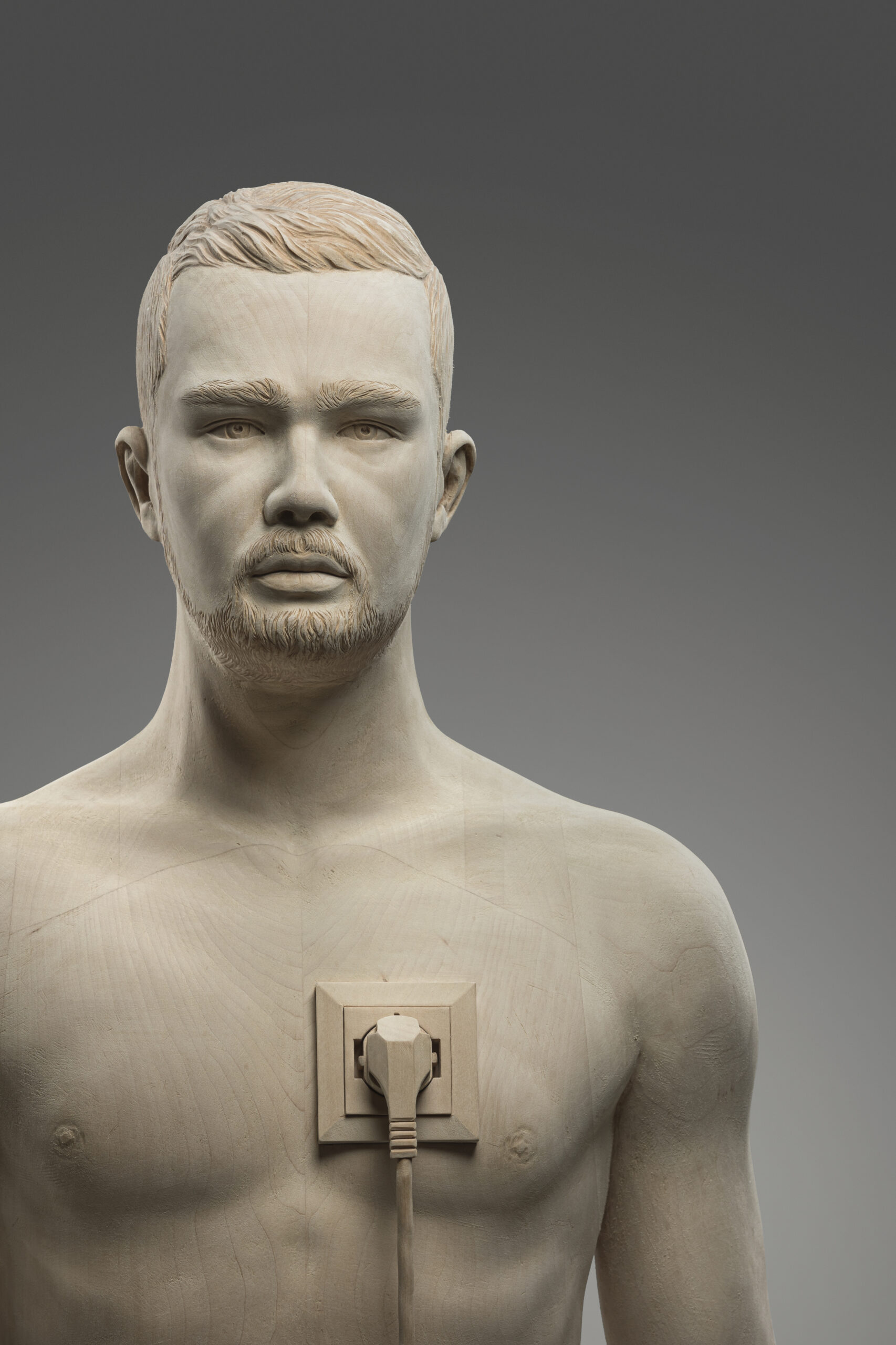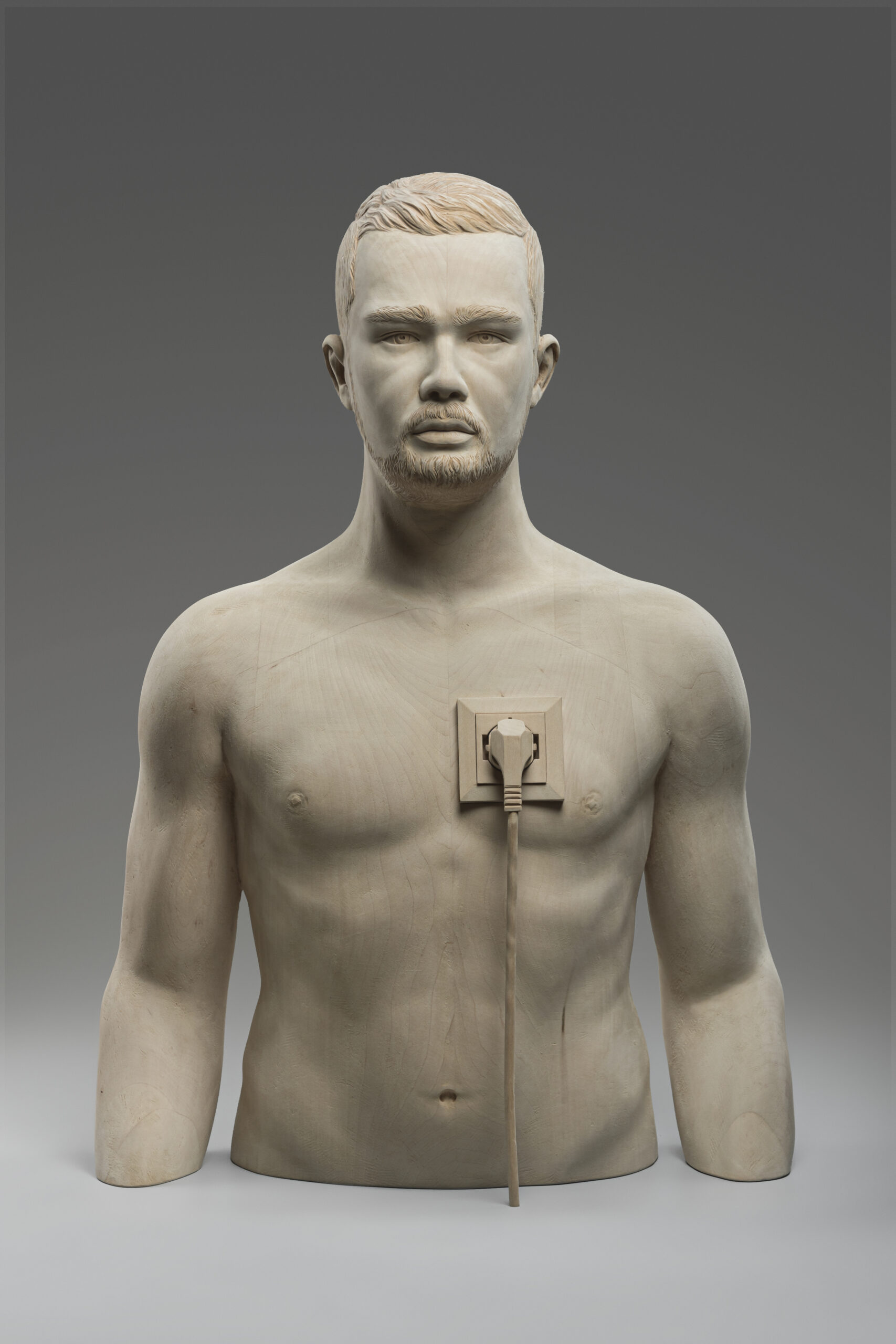 Mit Recharge Yourself übersetzt Thomas Delazer ein Thema unserer Zeit in eindrückliche Bildsprache. Der realistisch gearbeitete Männerkörper aus Lindenholz trägt mitten auf der Brust eine Steckdose, in die ein Kabel eingeführt ist. Der Körper wird so zu einer Metapher für den modernen Menschen, der zwischen Erschöpfung und dem Bedürfnis nach Aufladung steht. Die feine handwerkliche Präzision verbindet sich mit einer klaren Symbolik: Energie und Lebenskraft sind nicht selbstverständlich, sondern müssen bewusst gepflegt und erneuert werden. Ein Werk, das zum Nachdenken über Abhängigkeit, Vitalität und den Rhythmus des eigenen Lebens einlädt.