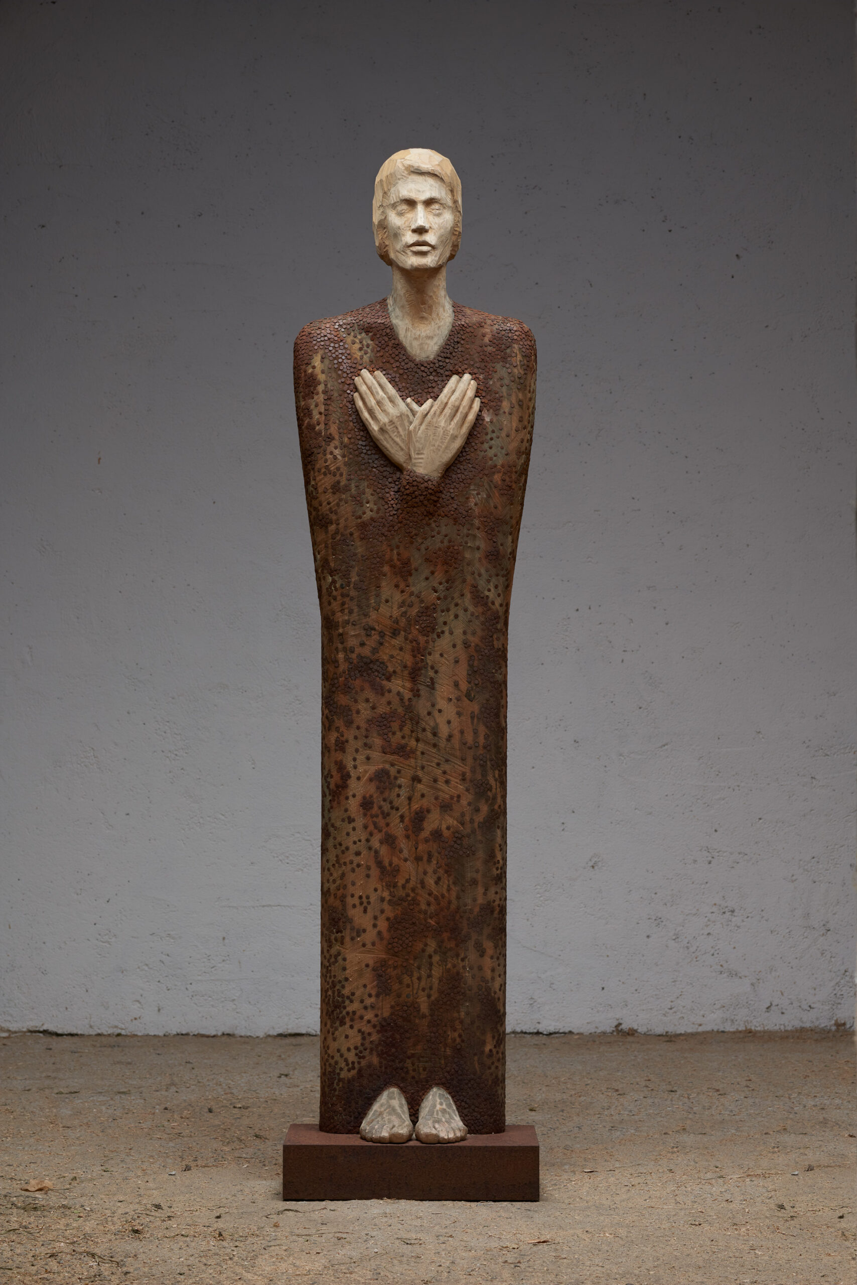 Eine Figur mit verschränkten Händen vor der Brust, deren Oberfläche von unzähligen rostfarbenen Nägeln durchzogen ist – Symbol für Selbstreflexion und emotionale Tiefe.
