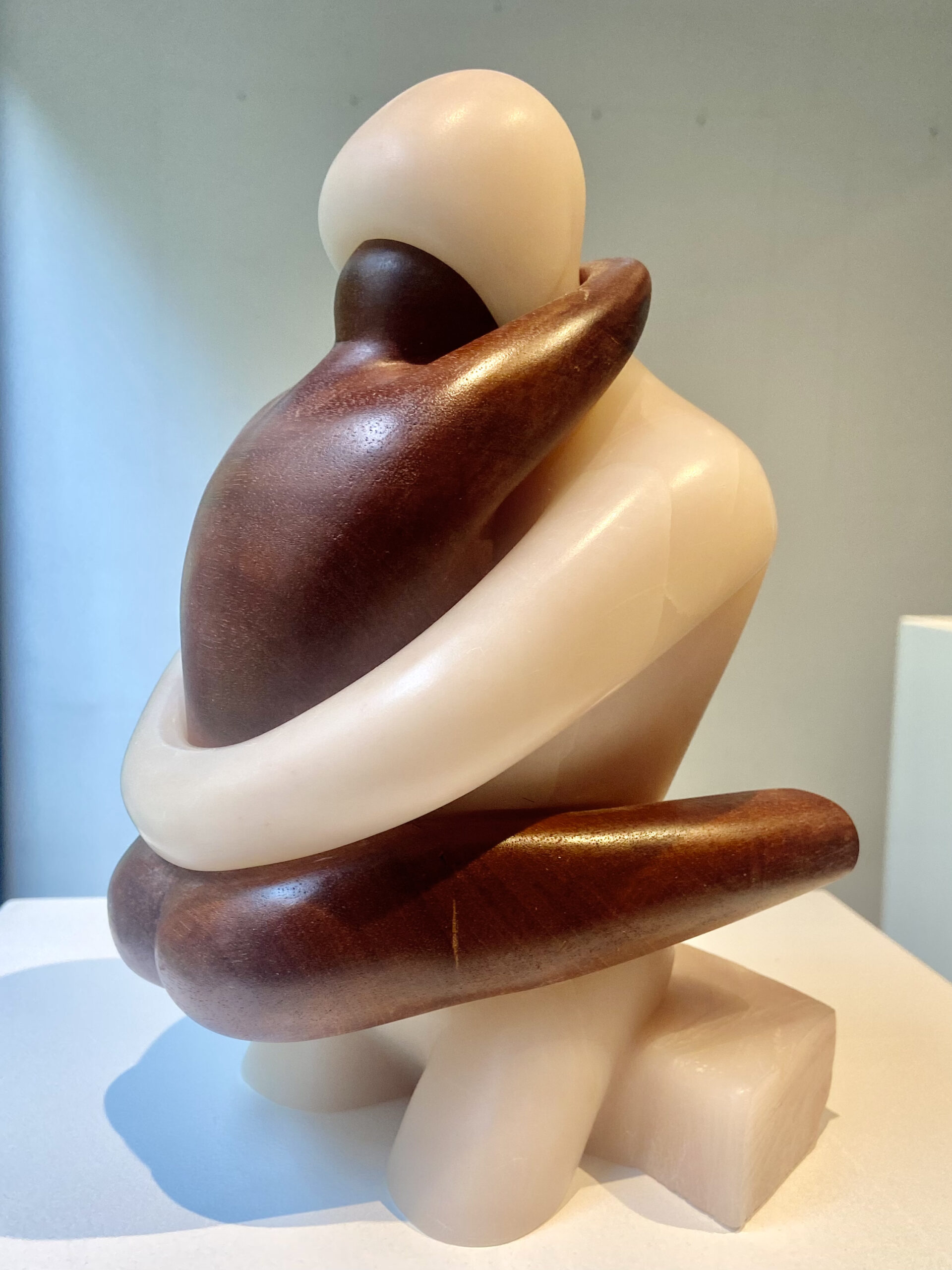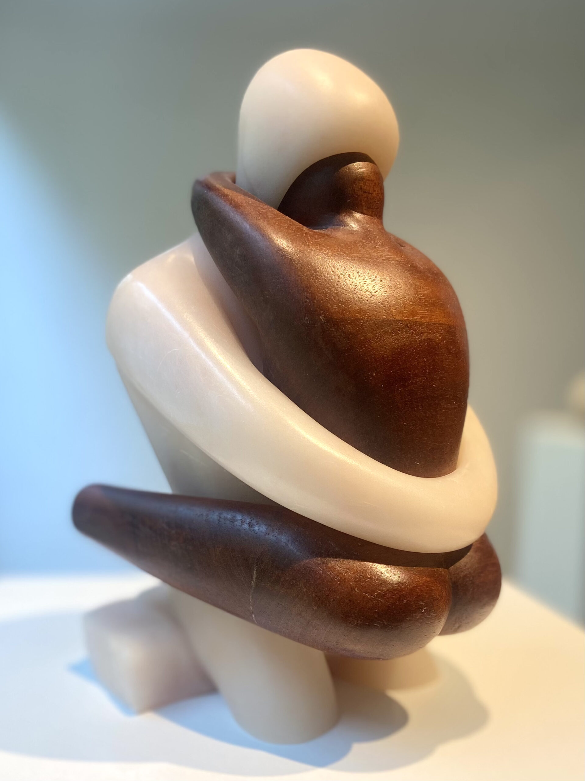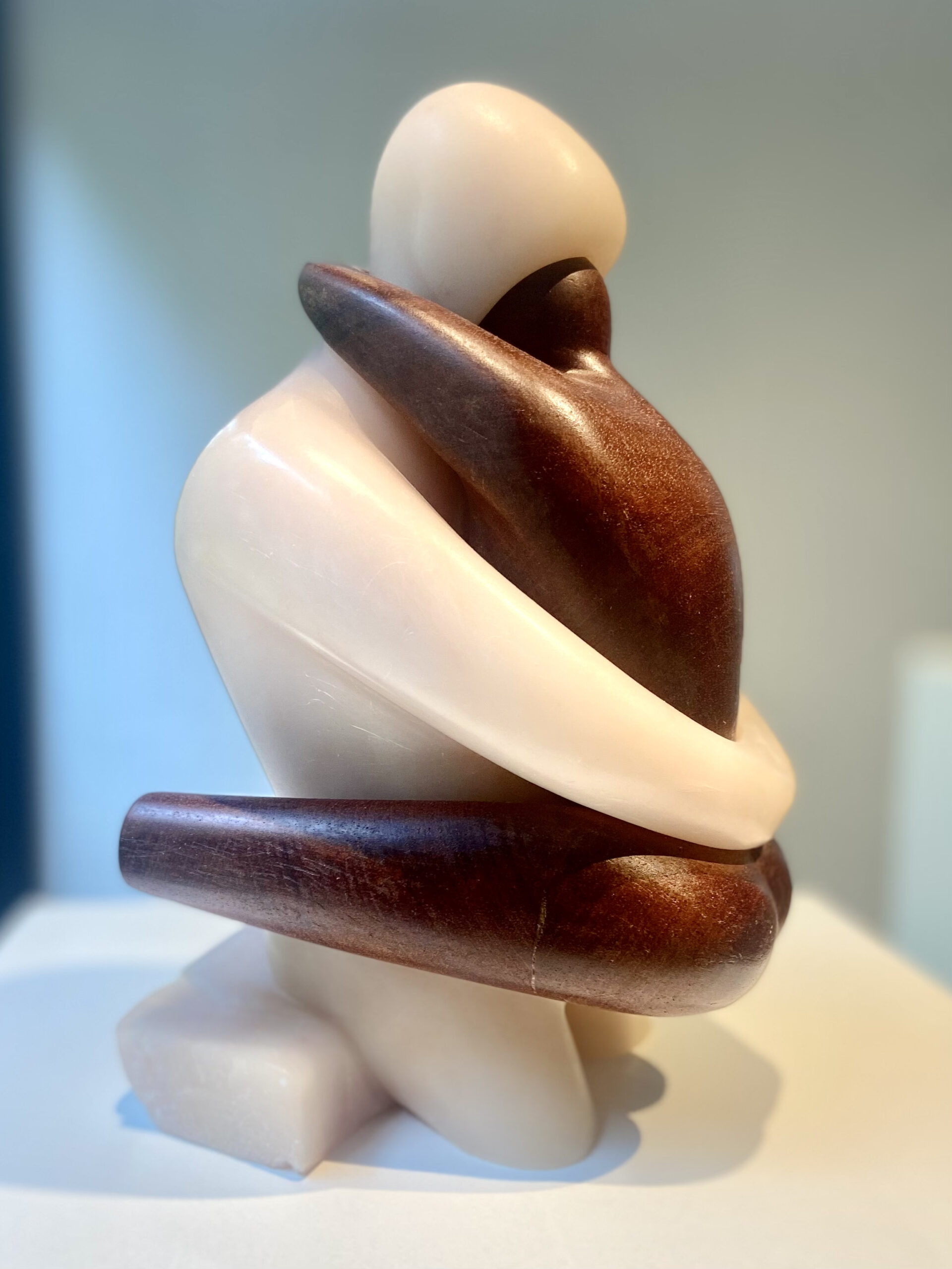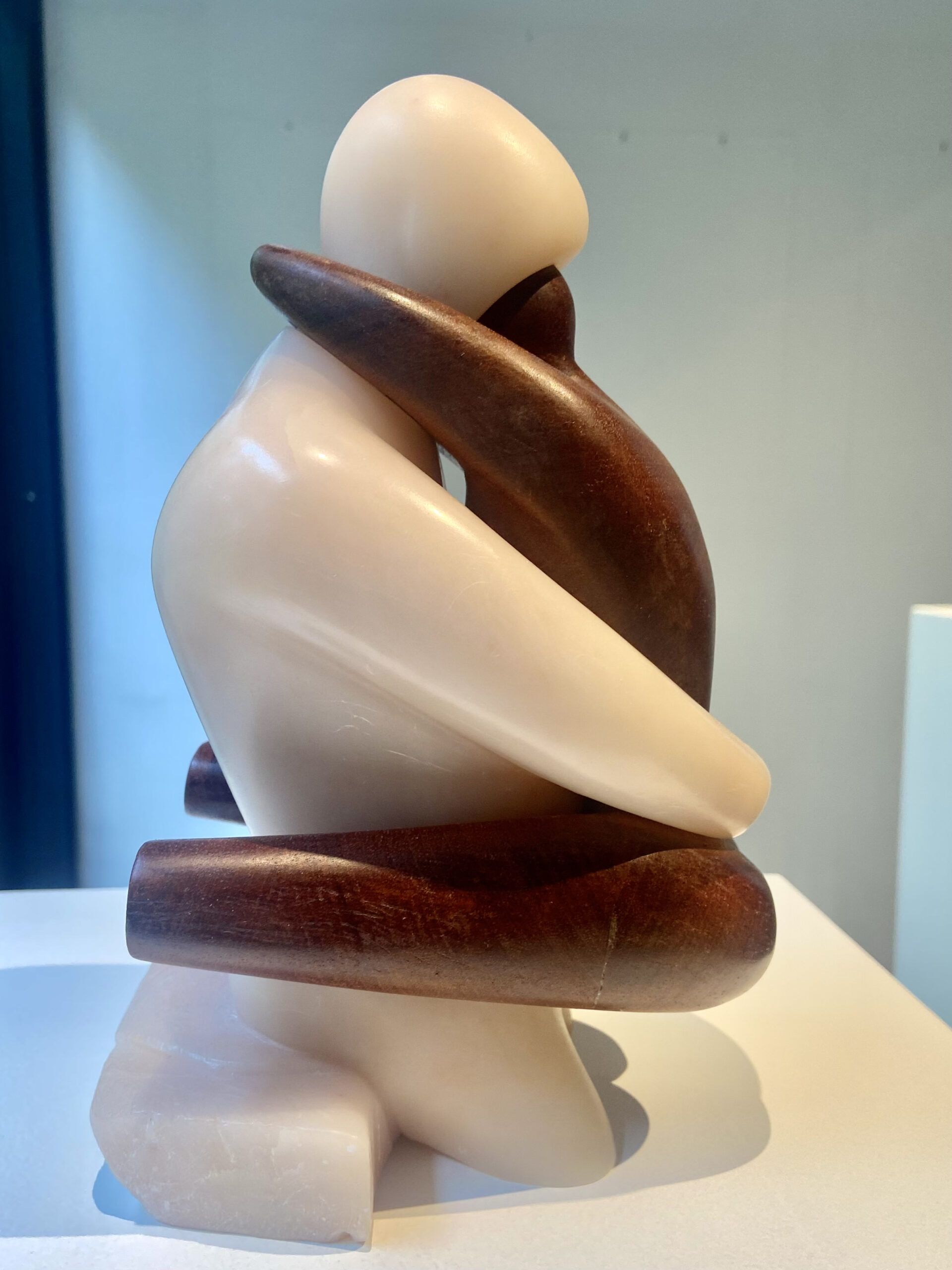 In der Skulptur Symbiosis thematisiert Michael Blochberger die haptische und visuelle Verschmelzung zweier Gegensätze. Die Komposition lebt vom spannungsvollen Materialdialog: Die organischen, warmen Kurven dunklen Teakholzes treffen auf die kühle, helle Monumentalität des Specksteins. Blochberger reduziert die menschliche Form auf ihre essenzielle Silhouette, wodurch die Geste der Umarmung eine universelle Gültigkeit erlangt.