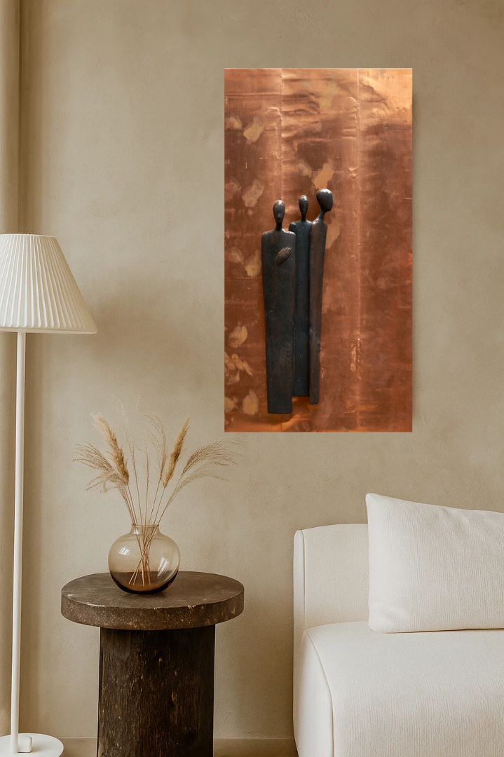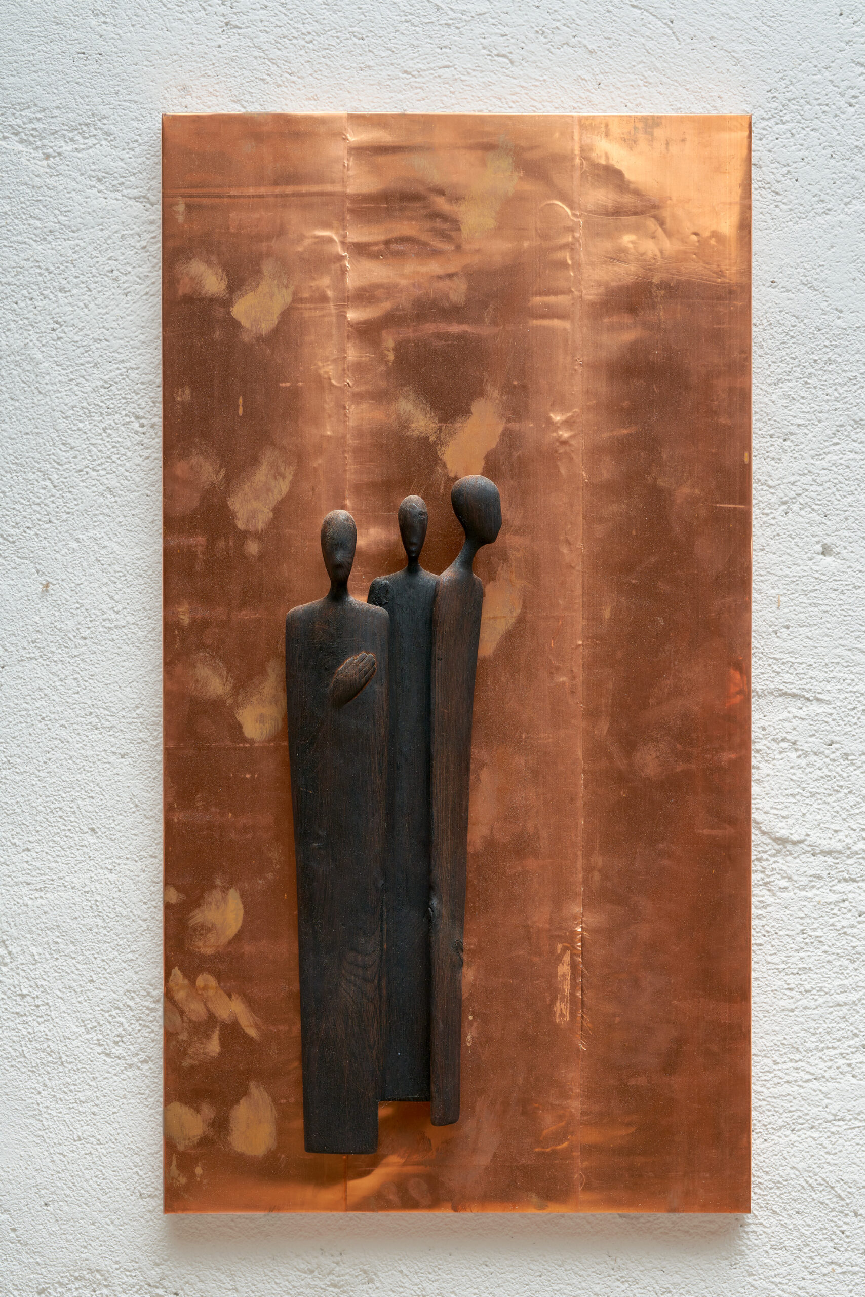 In „Zwischen uns“ begegnen sich drei Figuren in einer fast sakralen Ruhe. Die reduzierte Formensprache und das verkohlte Lindenholz verleihen dem Werk eine archaische Tiefe – als wären diese Gestalten Überreste einer Erinnerung oder Vorboten einer inneren Wahrheit. Der Kupfergrund reflektiert Wärme und Zeit, steht im Kontrast zur Dunkelheit der Körper und lässt dabei eine eigene Spannung entstehen.