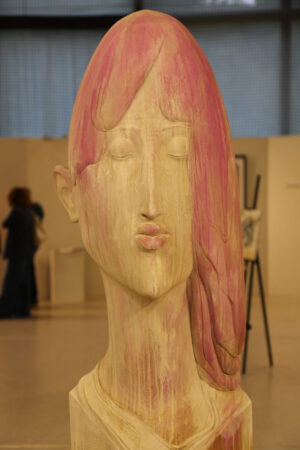 Eine hochaufragende Figur mit geschlossenen Augen, in sanfte Rosa- und Cremetöne gehüllt. Sie wirkt wie aus einer anderen Welt – still, träumerisch, entrückt.