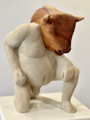 „Lost in Fate“ zeigt den Minotaurus als tragisches Opfer. Der Kontrast aus Stein und Holz sowie die gebeugte Pose symbolisieren Schmerz und Resignation – ein Mahnmal für Toleranz und Wahrhaftigkeit.